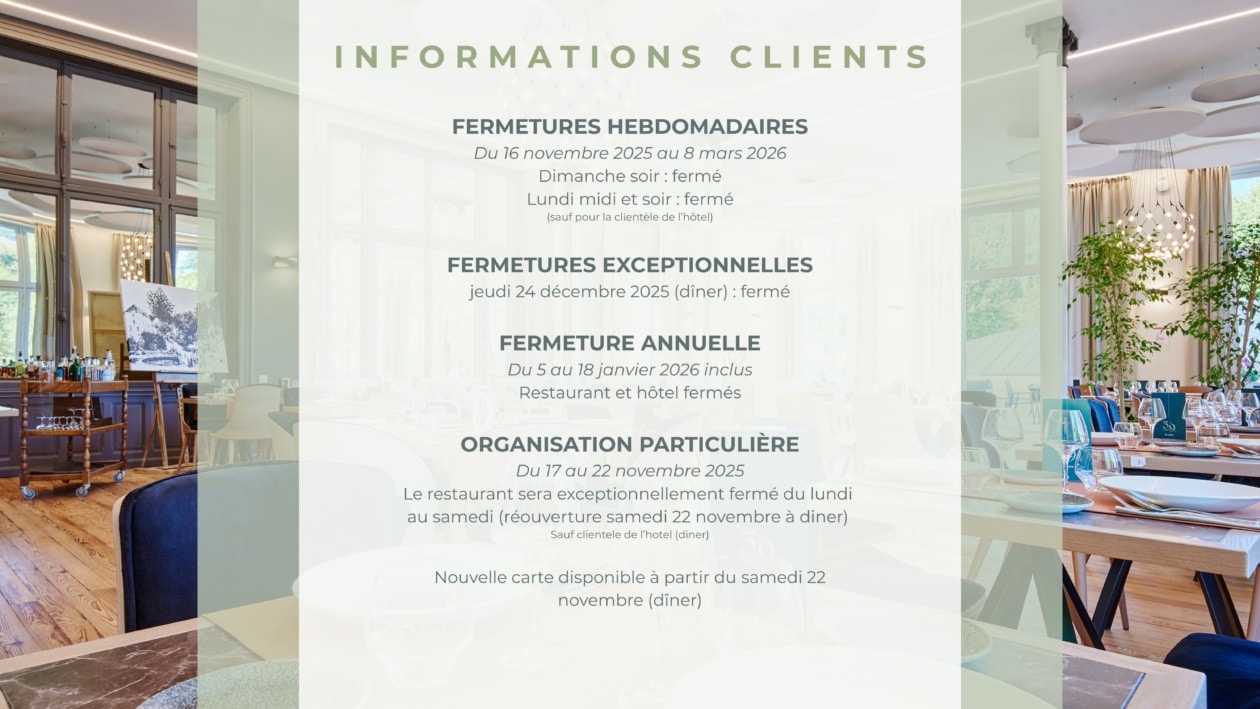 Le restaurant sera fermé le dimanche soir et le lundi midi & soir du 16 novembre 2025 – 8 mars 2026